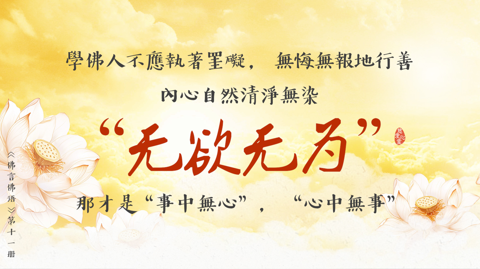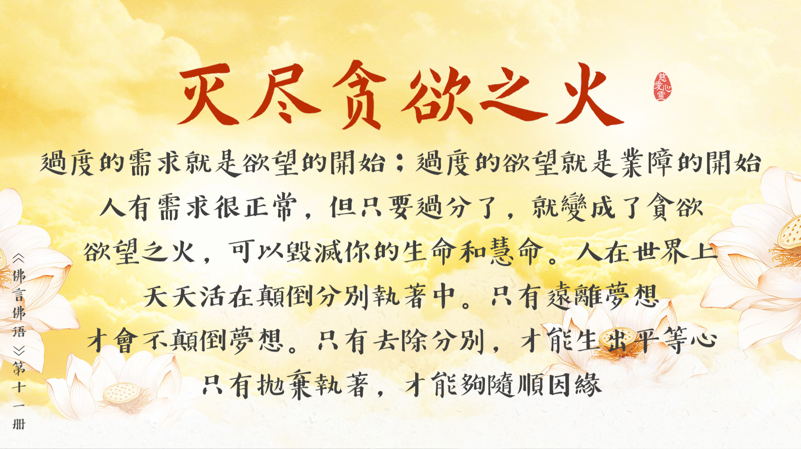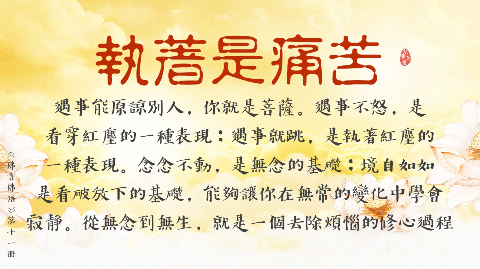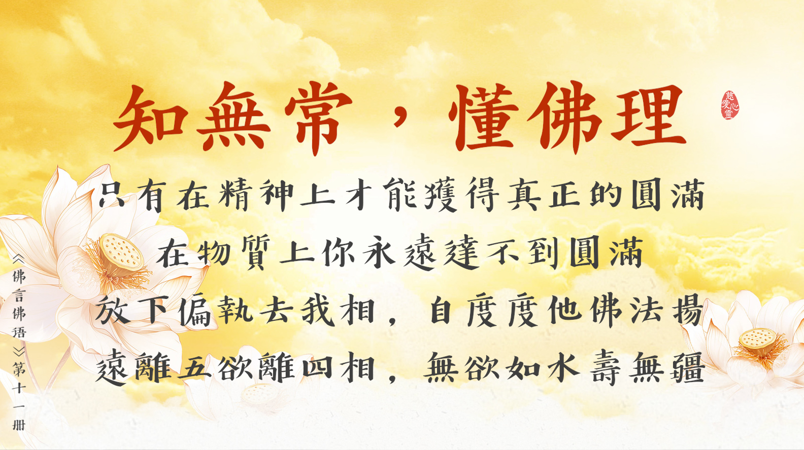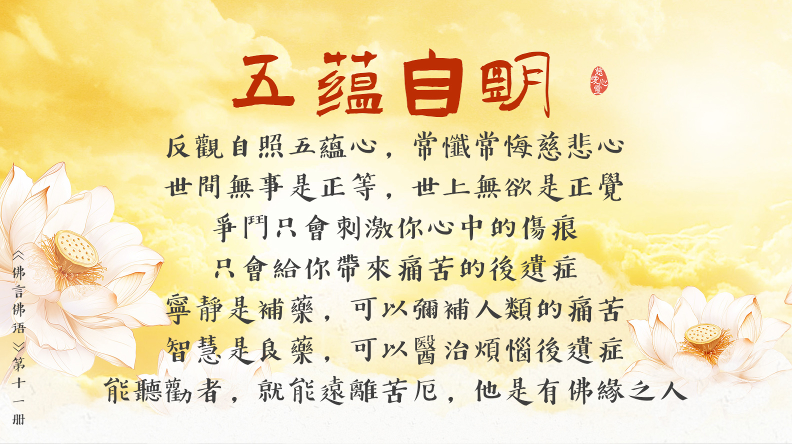 反觀自照五蘊心, 常懺常悔慈悲心。世間無事是正等, 世上無欲是正覺。