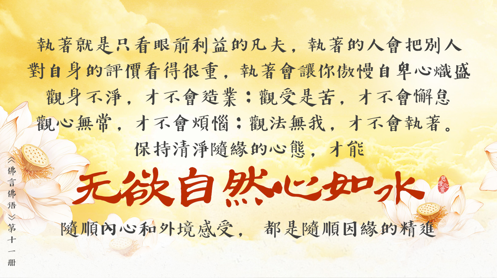 保持清淨隨緣的心態, 才能無欲自然心如水。隨順內心和外境感受, 都是隨順因緣的精進。