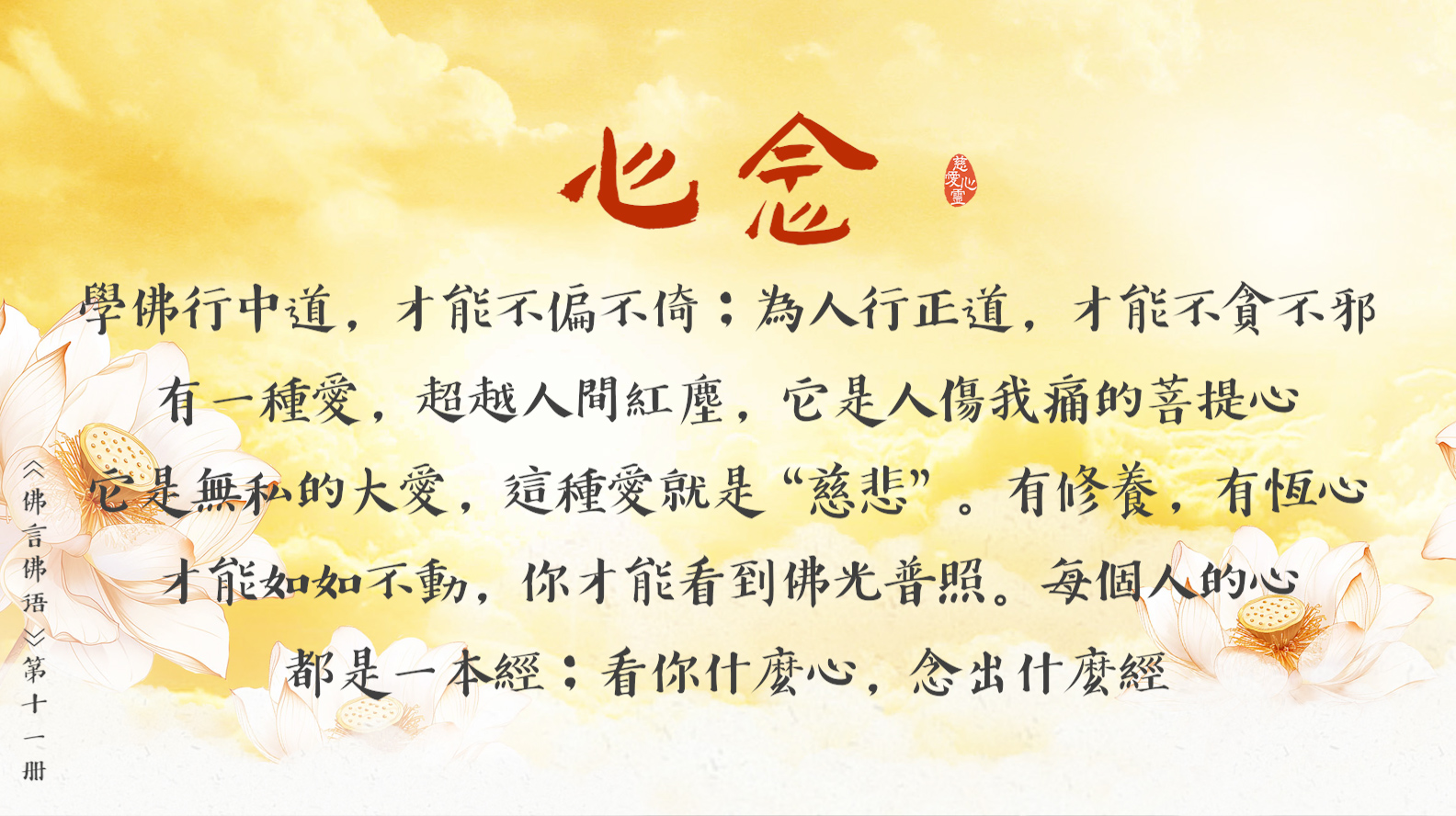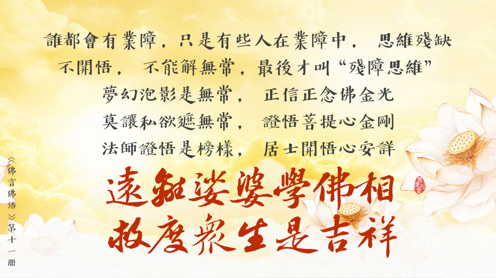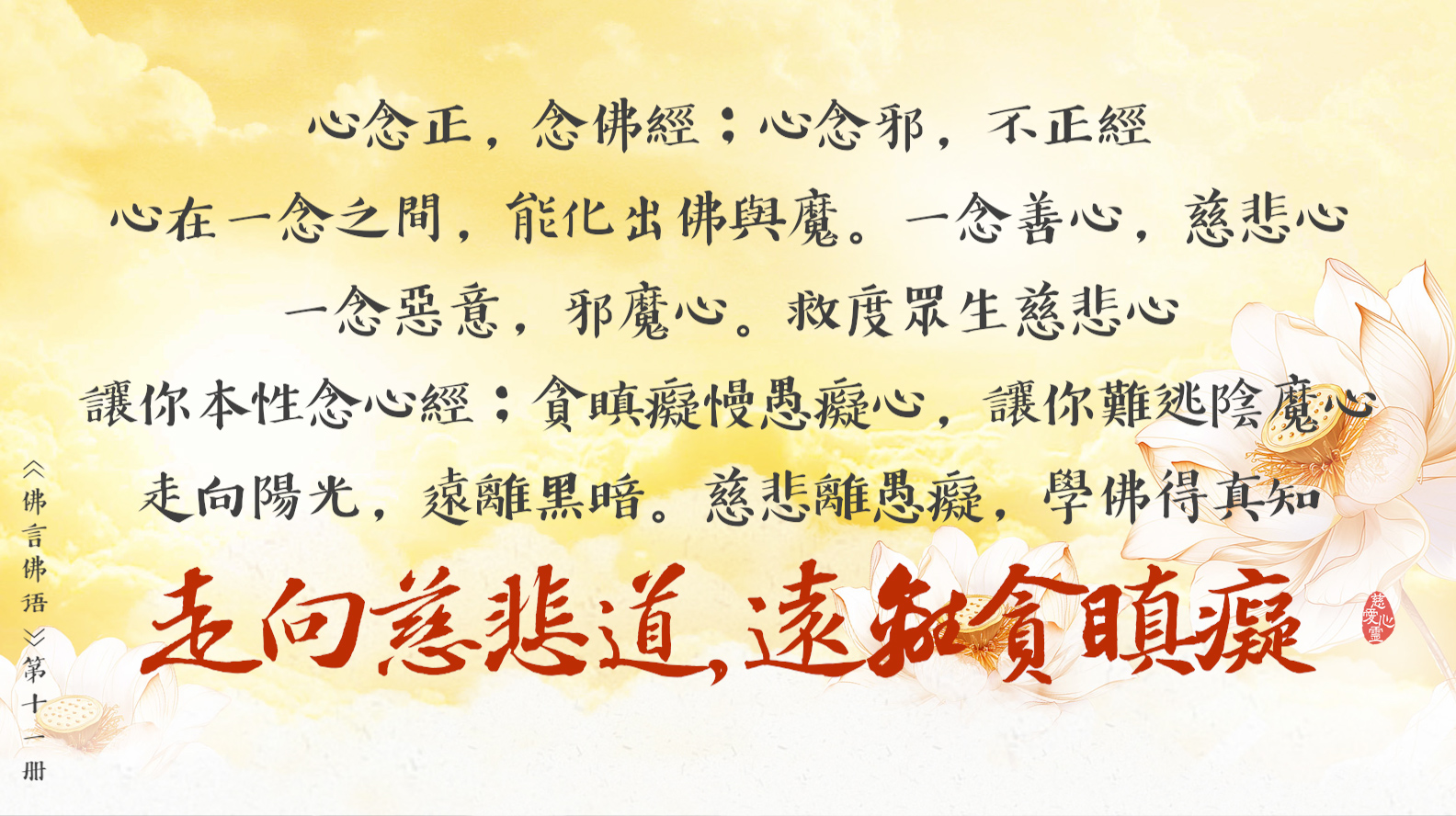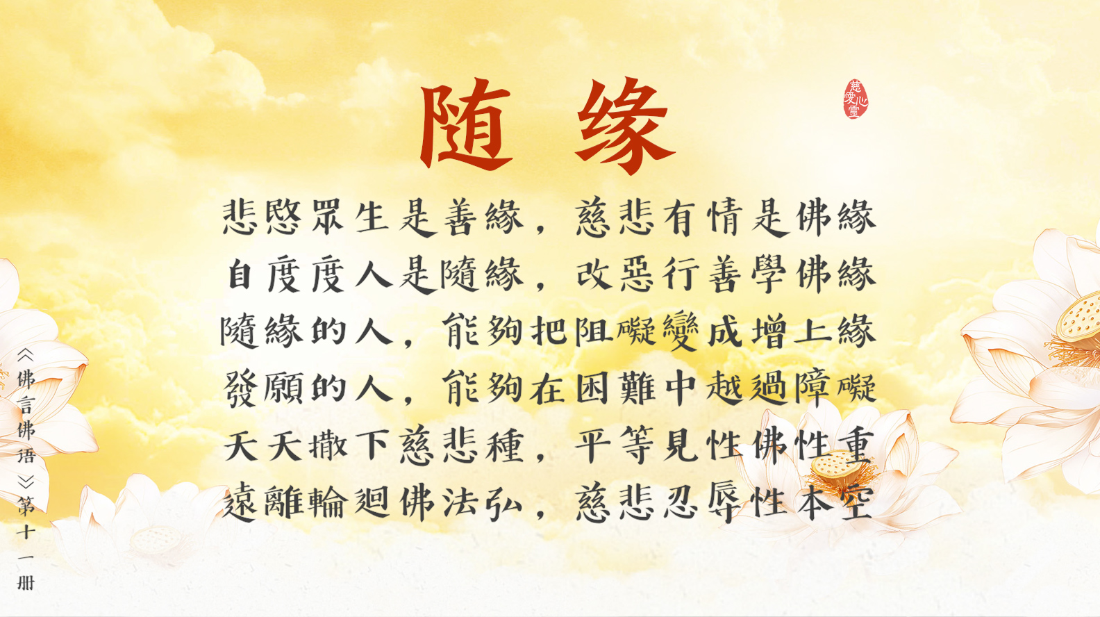 天天撒下慈悲種, 平等見性佛性重。遠離輪迴佛法弘, 慈悲忍辱性本空。