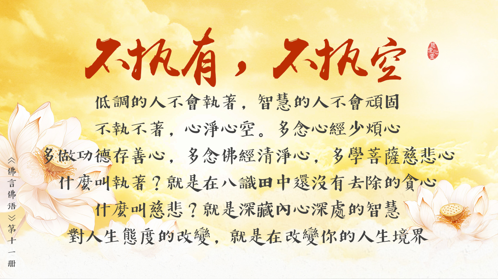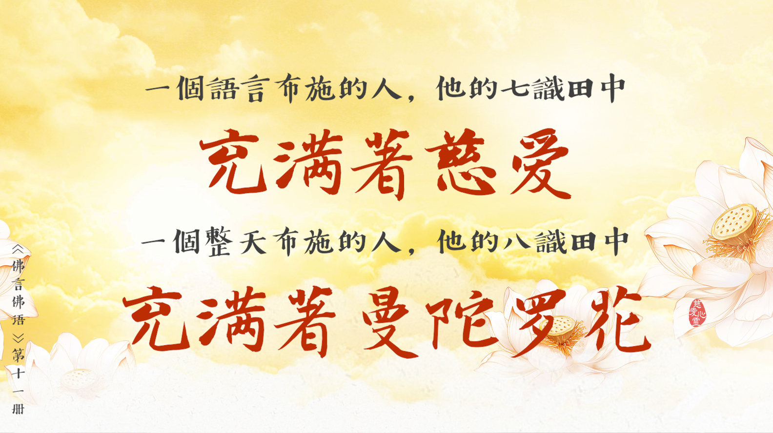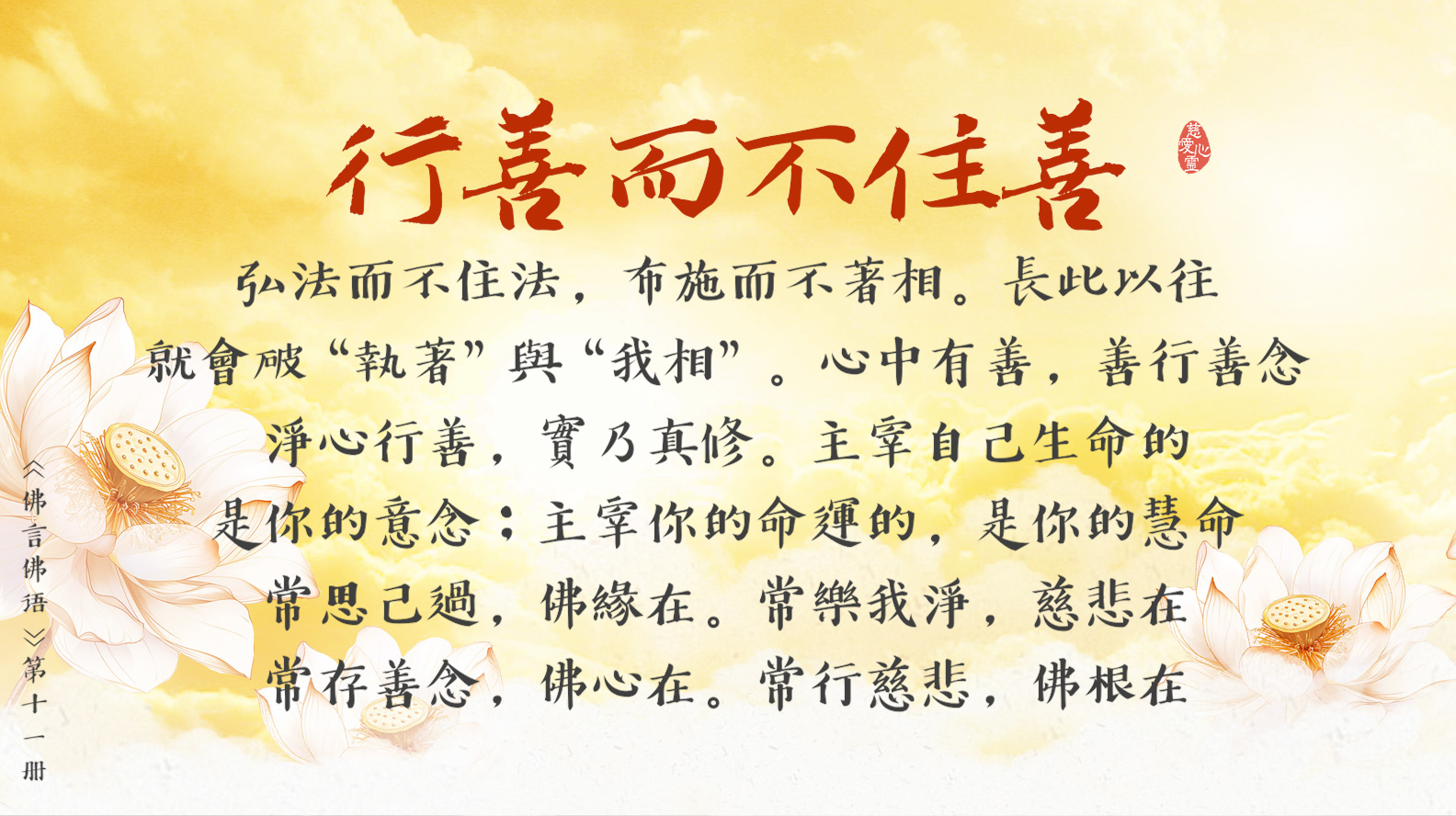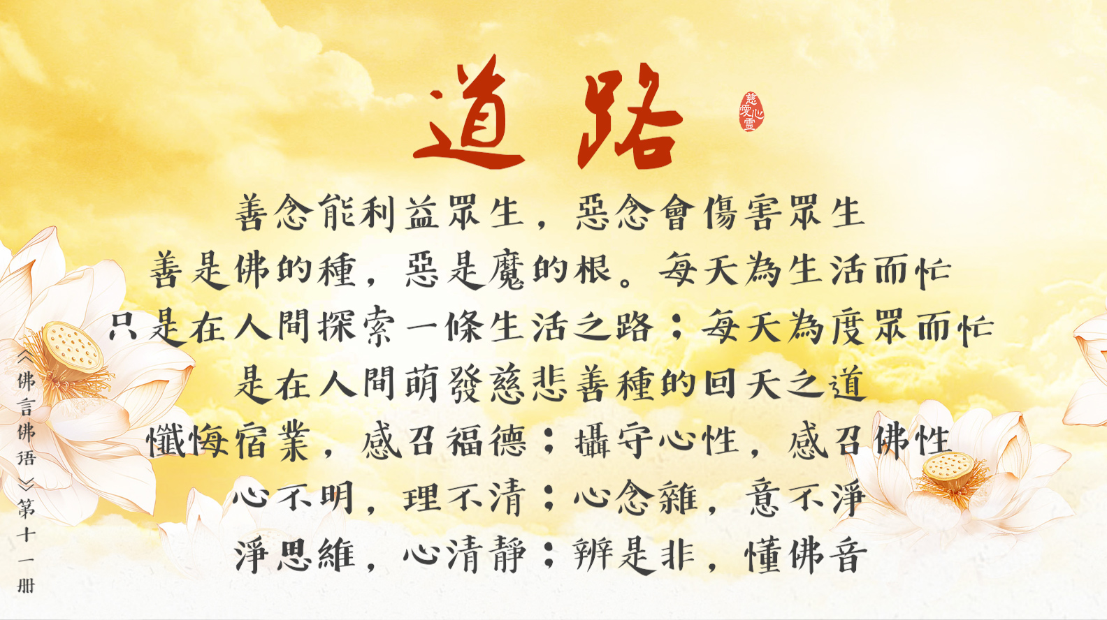 天天撒下慈悲種, 平等見性佛性重。遠離輪迴佛法弘, 慈悲忍辱性本空。