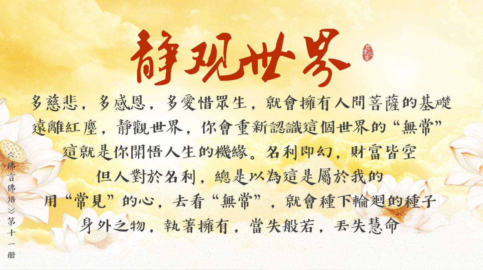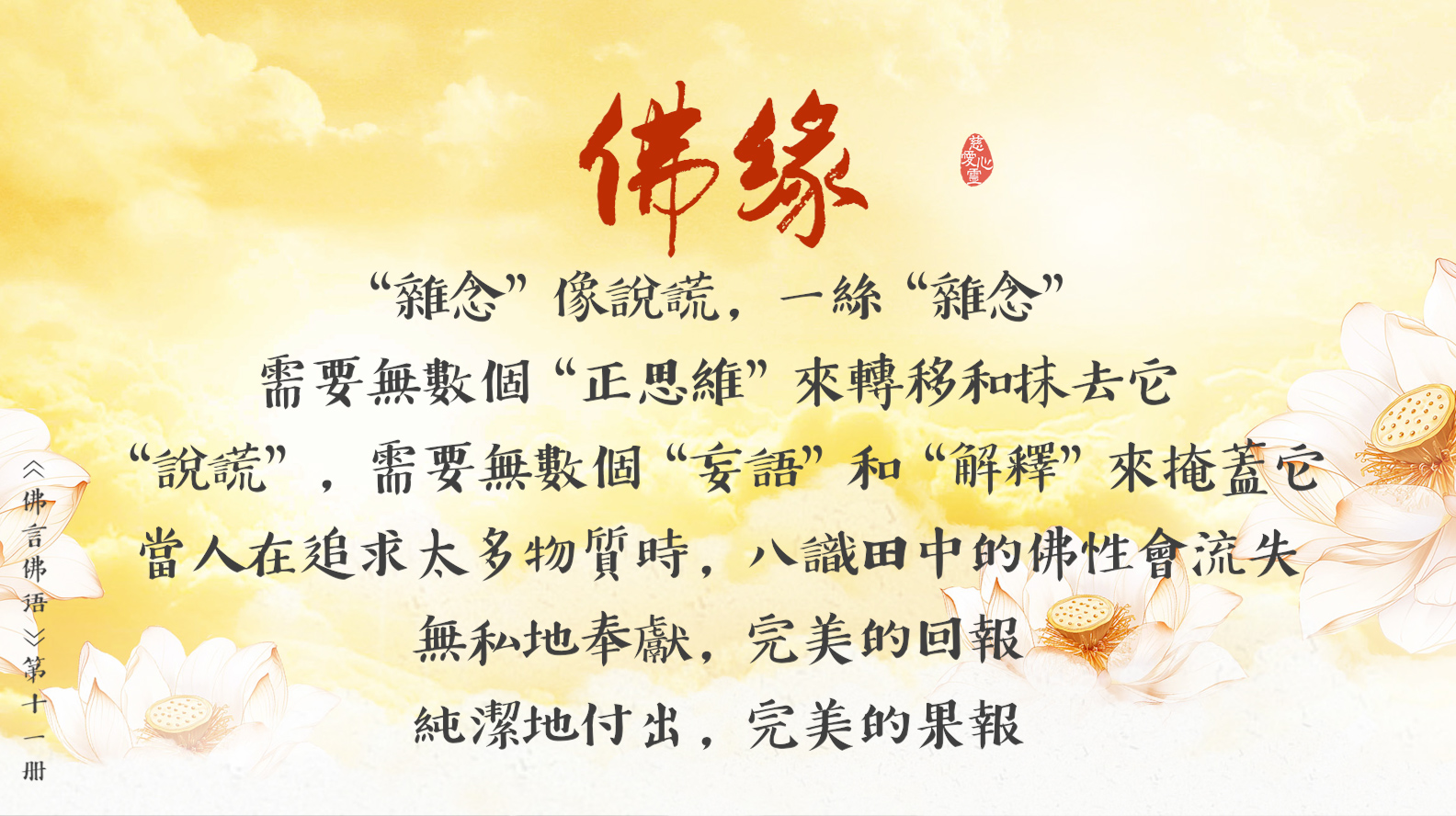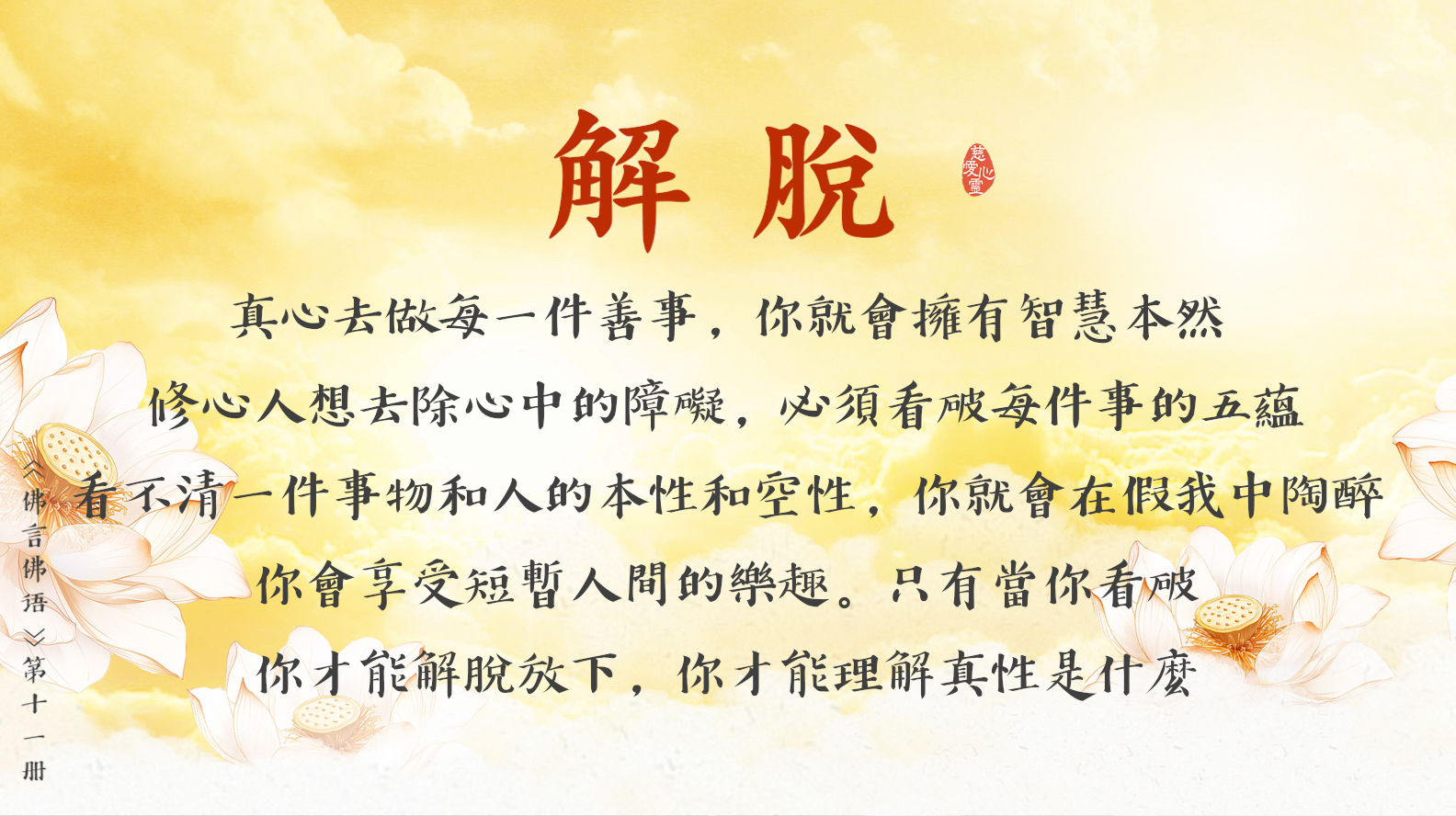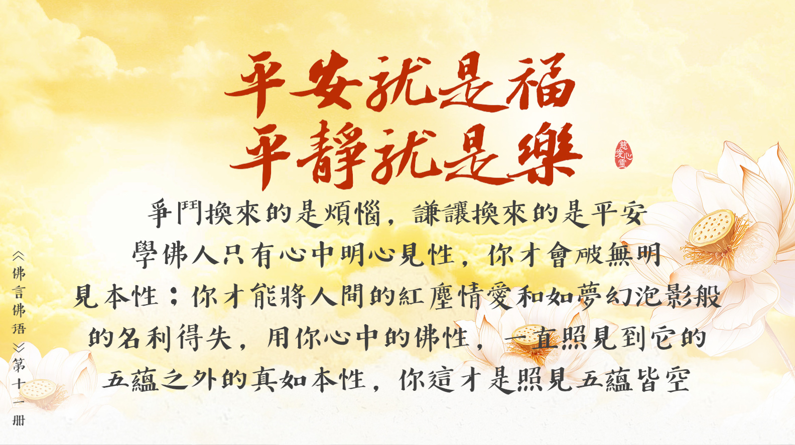 天天撒下慈悲種, 平等見性佛性重。遠離輪迴佛法弘, 慈悲忍辱性本空。