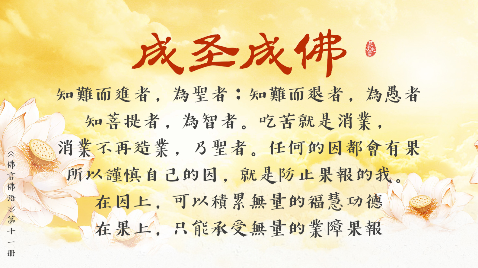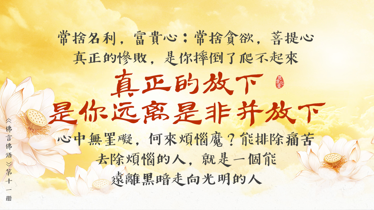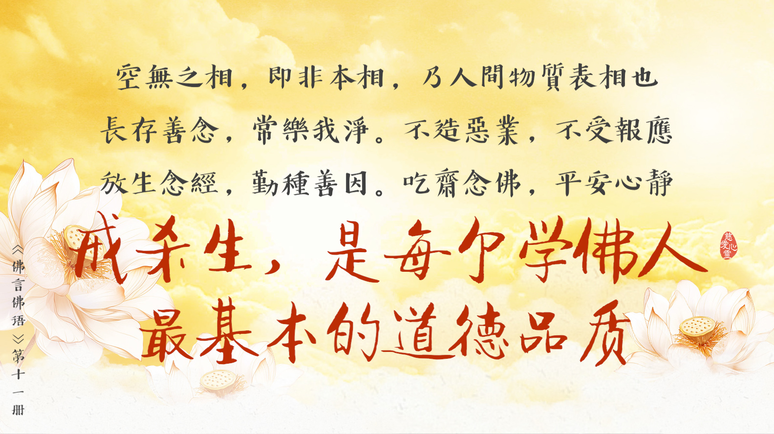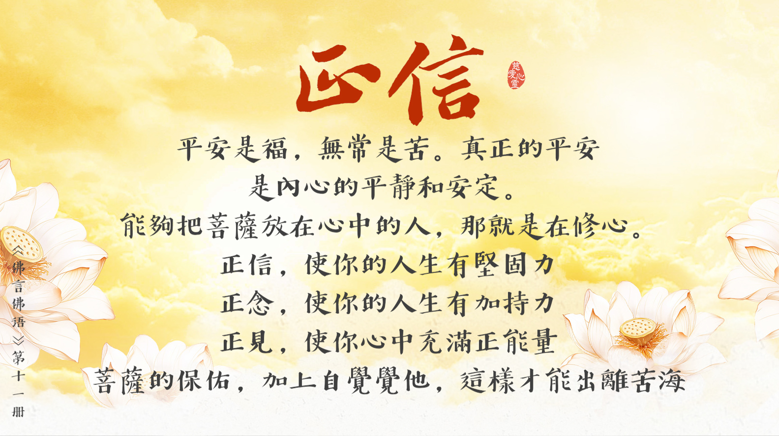 天天撒下慈悲種, 平等見性佛性重。遠離輪迴佛法弘, 慈悲忍辱性本空。