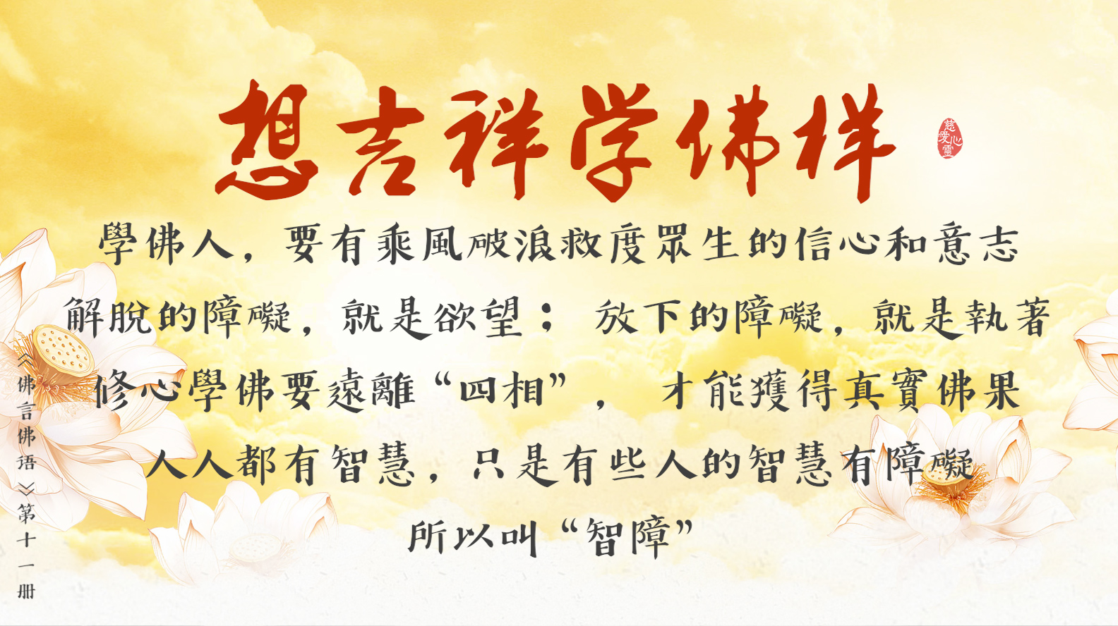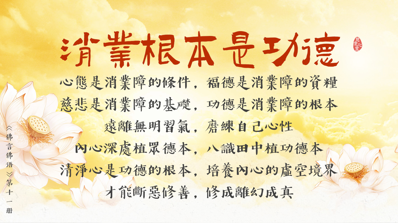 心態是消業障的條件, 福德是消業障的資糧, 慈悲是消業障的基礎, 功德是消業障的根本。