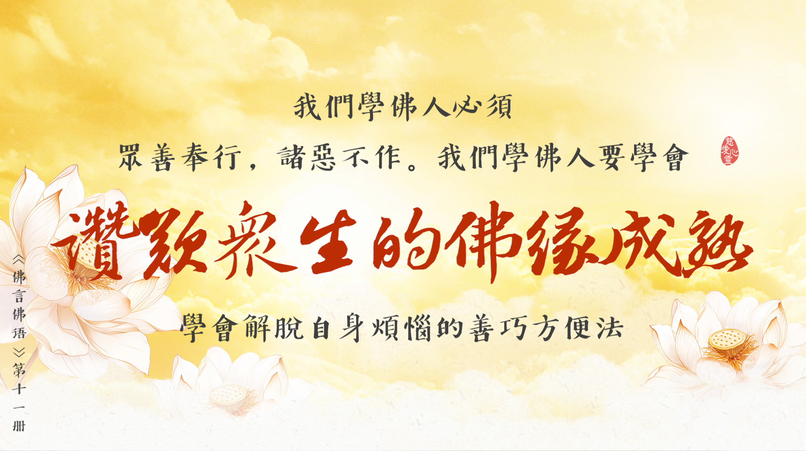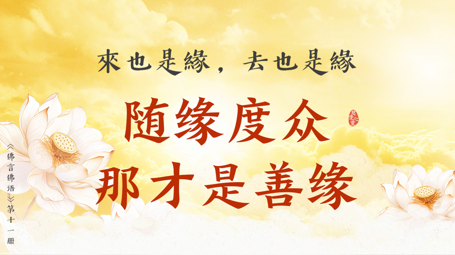悲愍眾生是善緣, 慈悲有情是佛緣, 自度度人是隨緣, 改惡行善學佛緣。