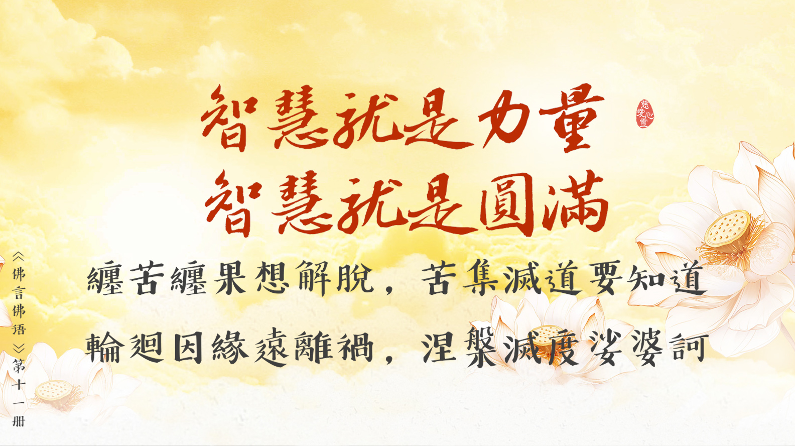 纏苦纏果想解脫, 苦集滅道要知道。輪迴因緣遠離禍, 涅槃滅度娑婆訶。
