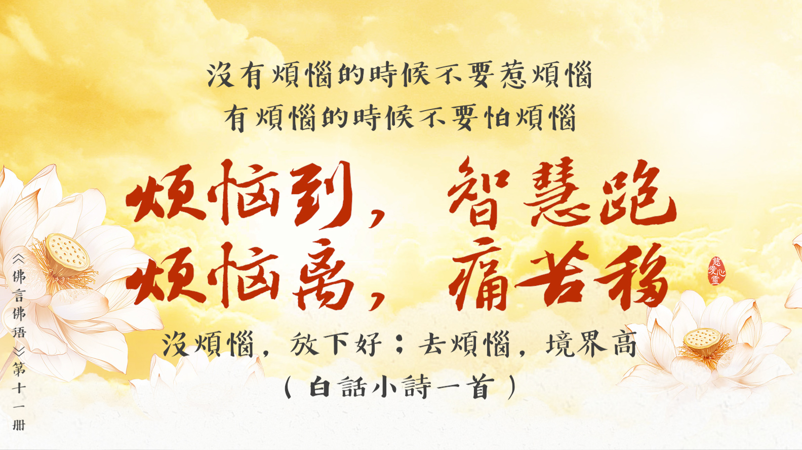 煩惱到,智慧跑; 煩惱離,痛苦移; 沒煩惱,放下好; 去煩惱,境界高。